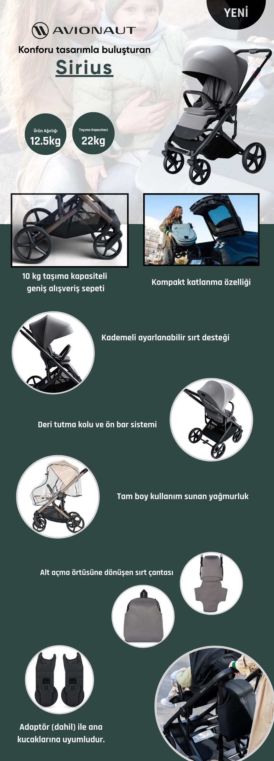 Neler Dahil: Sirius bebek arabası, sırt çantası, yağmurluk, Avionaut ana kucağı ve adaptörü
