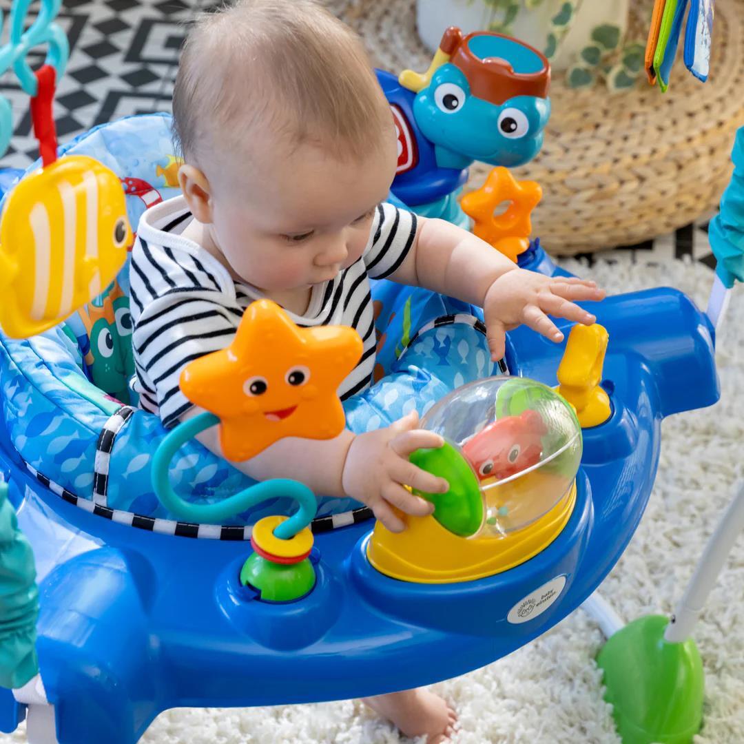 360 derece dönebilen oturma alanına sahip olan bebeğiniz, çıkarılabilir zemin oyuncağı ile zıplarken, keşfederken ve oynarken okyanusun görüntülerini ve seslerini her açıdan deneyimleyebilir.