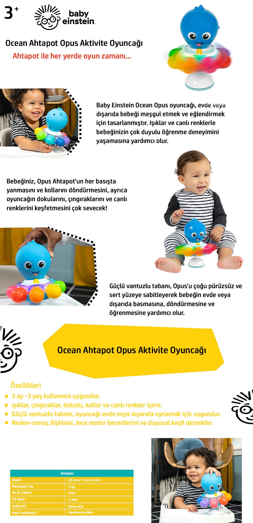 Baby Einstein Ocean Opus oyuncağı, evde veya dışarıda bebeği meşgul etmek ve eğlendirmek için tasarlanmıştır. Işıklar ve canlı renklerle bebeğinizin çok duyulu öğrenme deneyimini yaşamasına yardımcı olur. Bebeğiniz, Opus Ahtapot'un her basışta yanmasını ve kollarını döndürmesini, ayrıca oyuncağın dokularını, çıngıraklarını ve canlı renklerini keşfetmesini çok sevecek. Ebeveynler, bebeğin bu duyusal oyuncakla oynayarak kazandığı neden-sonuç ilişkisini, görsel uyarımı ve renk keşfini çok sevecek. Güçlü vantuzlu tabanı, Opus'u çoğu pürüzsüz ve sert yüzeye sabitleyerek bebeğin evde veya dışarıda basmasına, döndürmesine ve öğrenmesine yardımcı olur.