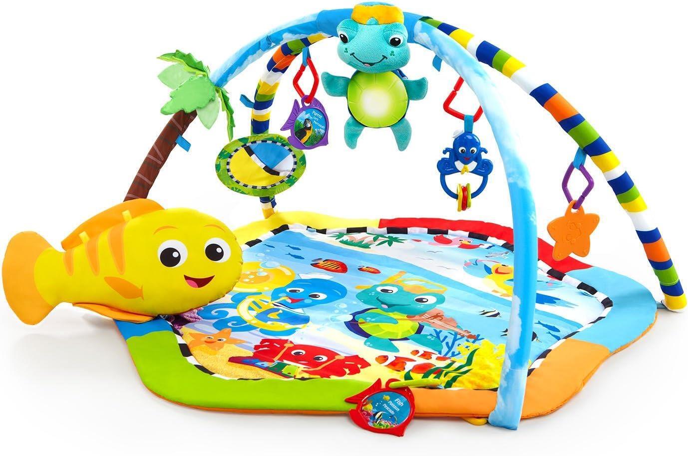 3D palmiye ağacı, bebekler için güvenli ayna, deniz yıldızı oyuncağı, ahtapot boncuk kovalayıcı ve gerçek hayattan görüntüler içeren flash kartlar bebeğinizi eğlendirir.