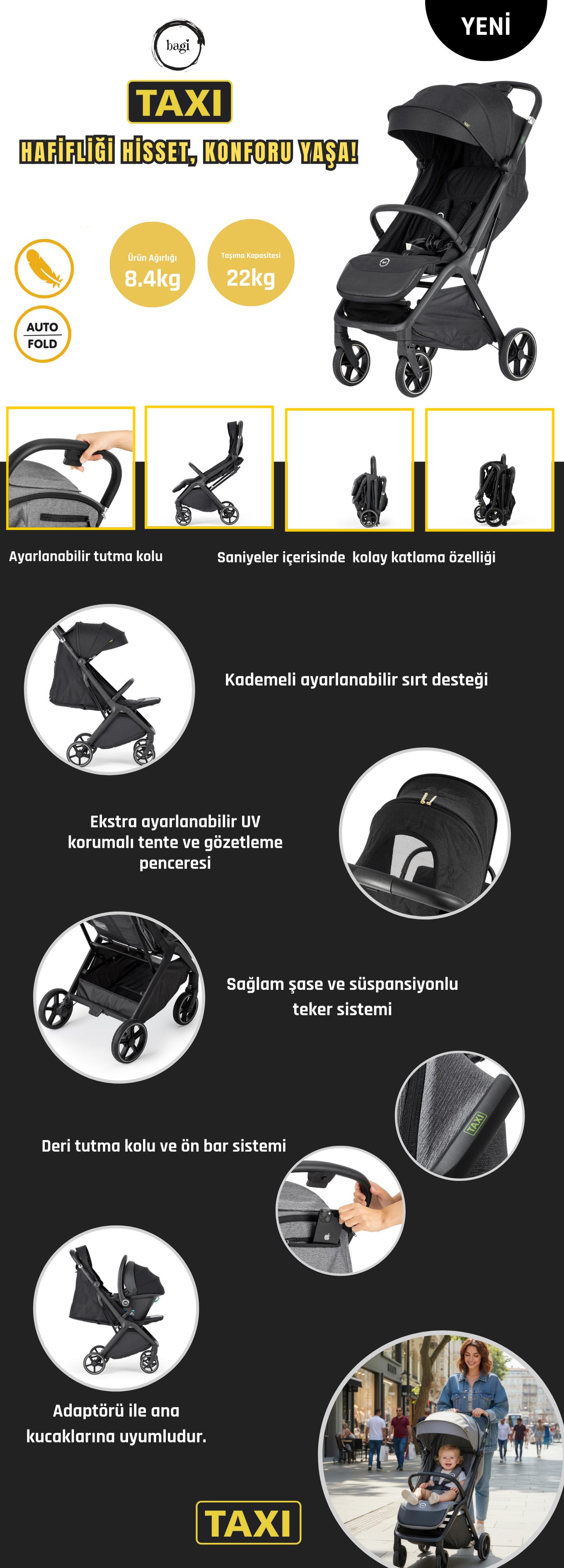 Kompakt kullanım özelliğinin yanında sürüş performansı ile dikkat çeken Taxi bebek arabası, her durumda siz ebeveynleri ve bebeklerini rahat ettirmek için tasarlanmıştır. Ayarlanabilir yatış kademesi sayesinde doğumdan itibaren kullanılabilir. Ayrıca ana kucağı uyumlu şekilde travel olarak kullanım imkanı da sunar.