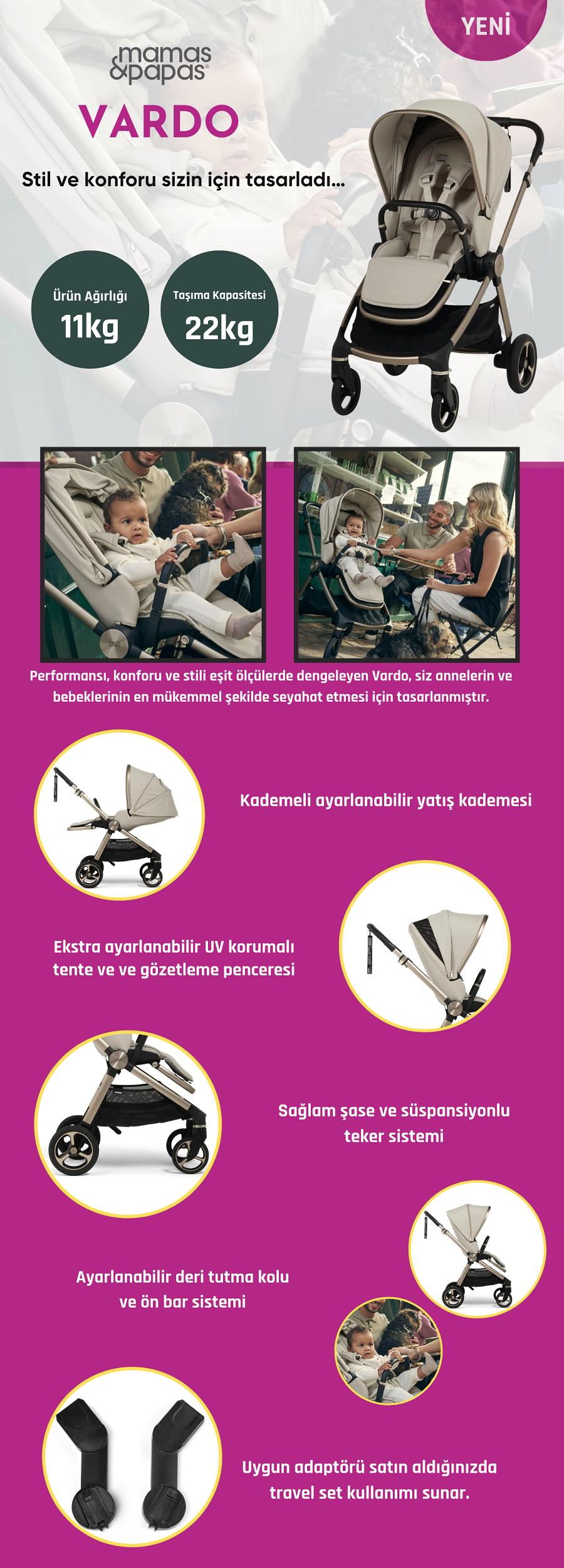 Performansı, konforu ve stili eşit ölçülerde dengeleyen Vardo, siz annelerin ve bebeklerinin en mükemmel şekilde seyahat etmesi için tasarlanmıştır.